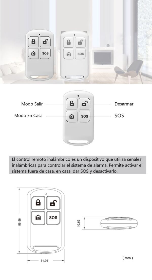 Este control remoto cuenta con cuatro botones programables, permitiendo mayor versatilidad al usarlo con diferentes funciones de su sistema de seguridad. Está alimentado por pilas tipo CR2032, asegurando un rendimiento prolongado y constante. La simplicidad en su uso permite que cualquier miembro de la familia pueda operar el sistema de alarma sin complicaciones.